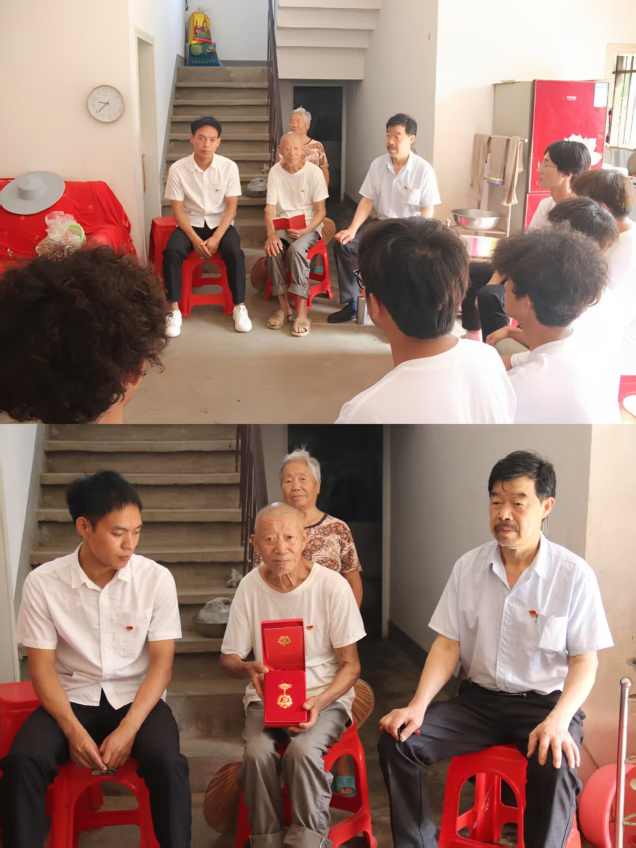 “芯”火青年志愿实践团的成员们来到了“光荣在党50年”的老党员刘诗永爷爷家中,大家围坐而谈,刘爷爷首先带领着大家共同学习了《中国共产党章程》,随后八十岁的他指尖抚过褪色的党徽,讲述了他在烽火岁月中的革命故事并深情寄语:“希望年轻人在专业领域传承红色基因,践行科技为民理念,既要赓续革命先辈服务人民的精神血脉,也要运用专业知识解决实际问题”。