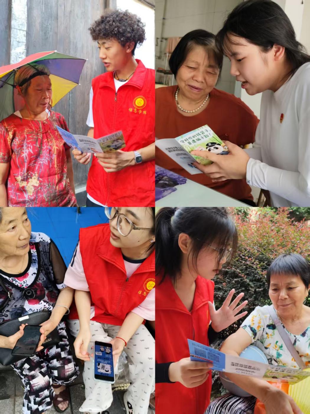讲解后,“芯”火志愿团成员们深入辖区内的小区,将反诈知识送到老人家门口,切实增强了老年群体的防诈意识和能力。成员们不仅耐心耐心地为居民们讲解宣传手册,帮助老年居民安装具有 AI 识别功能的反诈 APP-国家反诈中心,并演示其来电预警、短信拦截等功能,还教授他们如何使用智能语音助手,解答居民们提出的各类反诈疑问。