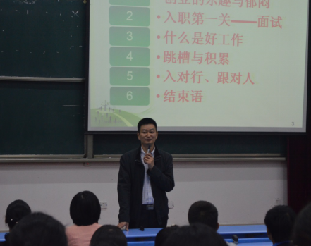 卿老师一上场就以幽默的演讲方式赢得了同学们对此次讲座的兴趣。首先卿老师凭借着自己在职场方面积累的经验和丰富的人生阅历给我们讲述了许多作为一个应聘者和创业者应该注重的方面。例如,去面试时,一定要注意自己的形象,并且一定要做好充分的准备。然后告诉我们选公司亦是选领导,选择一个好的领导对于我们来说是很重要的。他还告诫同学们,只有适合自己的工作才是好工作。卿老师在演讲中向同学们提了很多有关职场的问题,同学们回答的都很积极,现场气氛十分活跃。