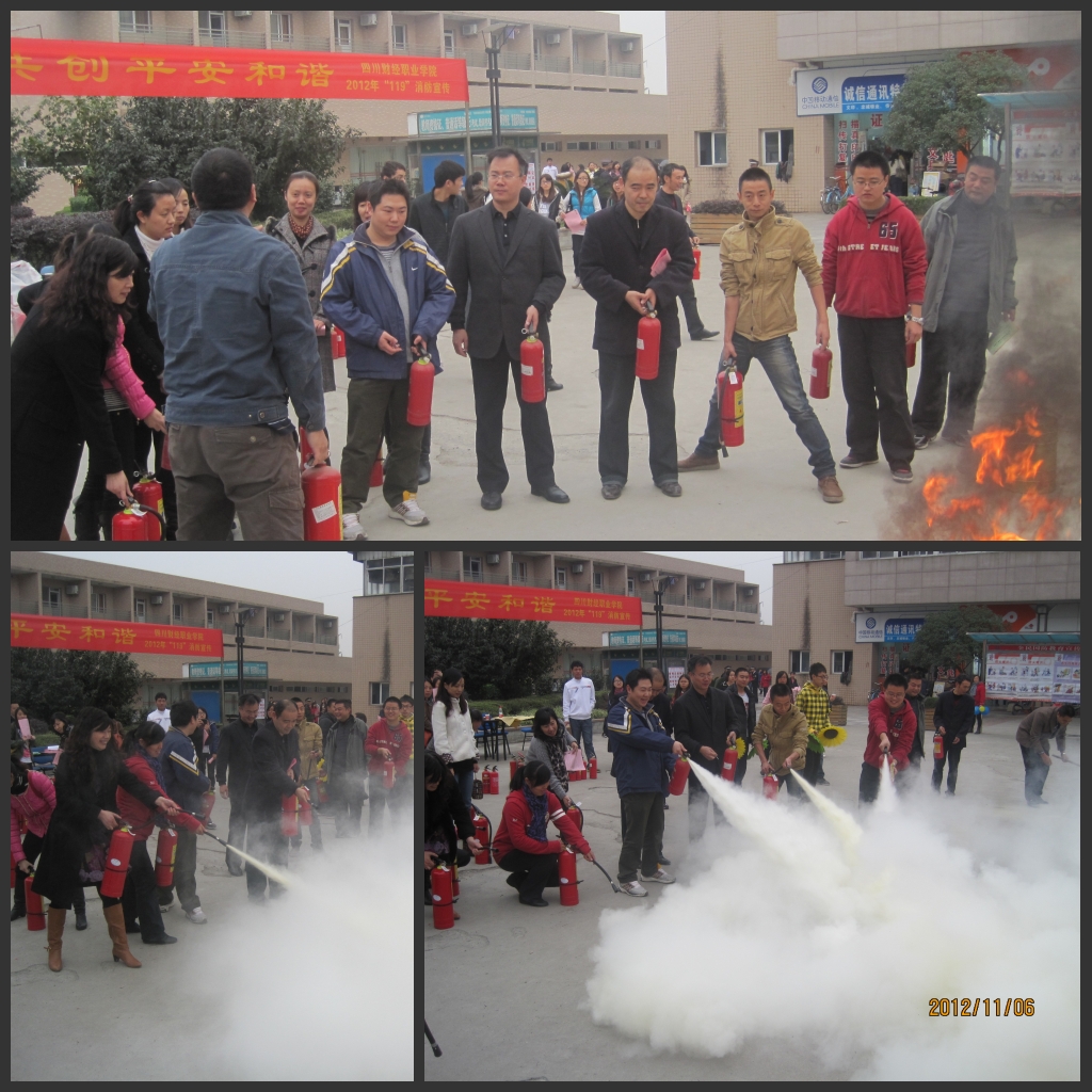 2012年11月6日中午12点30分,以“人人参与消防·共创平安和谐”为主题的消防知识宣传工作在学生公寓门前开展,院保卫处人员参与消防知识普及宣传,我系全体老师参与了该次消防演练。