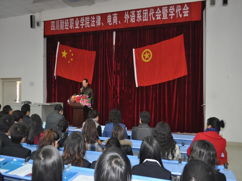 2011年3月15日下午13:30,会计信息管理系、经济法律系、外语系第一届团代会暨学代会在B213教室隆重举行。来自三系的126位学生代表、17位列席代表身穿职业装,佩戴代表证和列席代表证,出席了本次会议。学院院长李高伟、学院党委副书记张中伟、党政办主任李跃进、组织人事处处长李琪、系党总支书记傅丽、经济法律系党支部书记李如万、外语系党支部书记李开柱、院团委书记刘丹书及三系辅导员教师作为嘉宾出席了本次会议,会议由学生党支部书记翟兴旺老师主持。