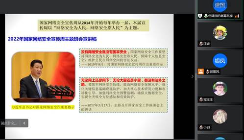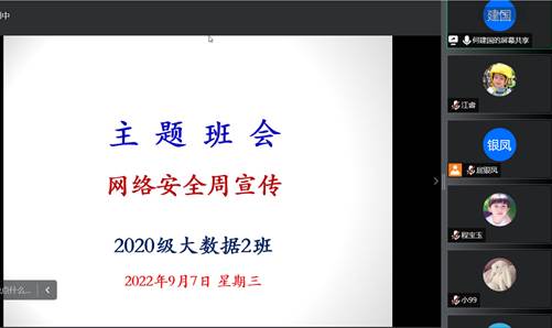 为深入学习贯彻习近平总书记关于网络强国的重要思想,全面普及《网络安全法》《数据安全法》《个人信息保护法》等法律法规,使广大师生牢固树立“没有网络安全就没有国家安全”的意识,自觉维护网络安全工作,争做网络安全的参与者、守护者和贡献者,提升全院师生网络安全意识和防范能力。9月6日,信息学院组织开展了“网络安全为人民,网络安全靠人民”线上主题班会,由各班辅导员主讲,各班级学生积极参加。