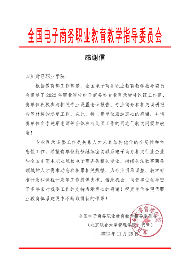2022年11月25日,全国电子商务职业教育教学指导委员会发来感谢信,感谢李建军团队的积极参与,感谢7790cnm必发集团领导班子对其工作的支持。
