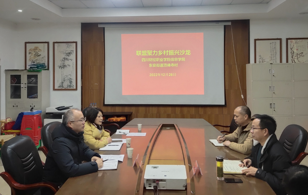 2022年12月26日,信息学院院长李建军、信息学院党总支书记傅丽、专职组织员翟兴旺共同前往龙泉驿区东安街道顶佛寺村党群服务中心,参加联盟聚力乡村振兴沙龙主题活动。