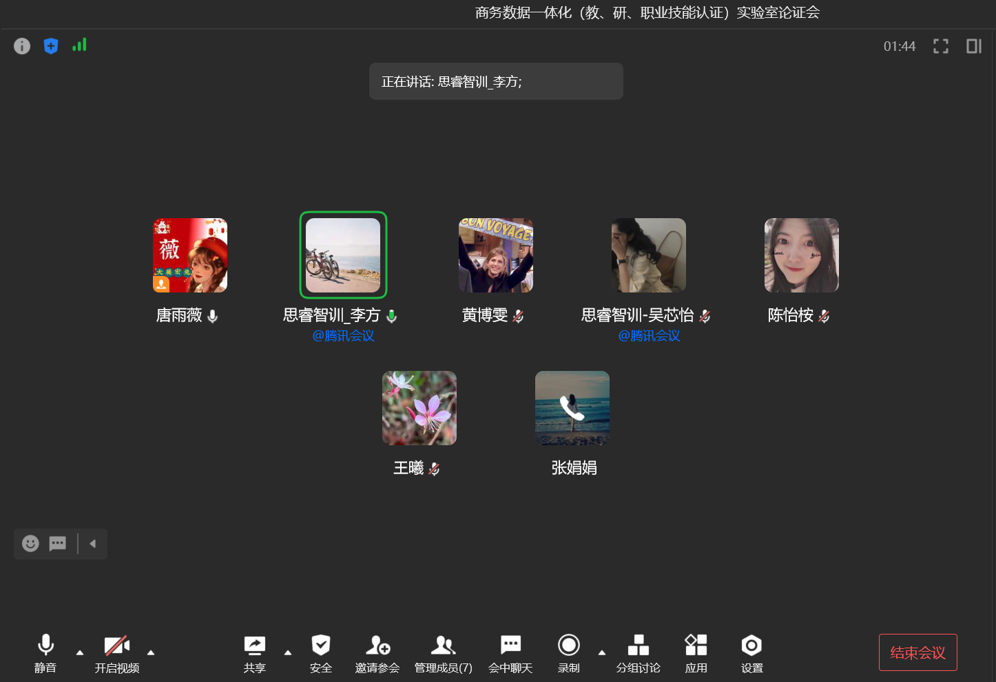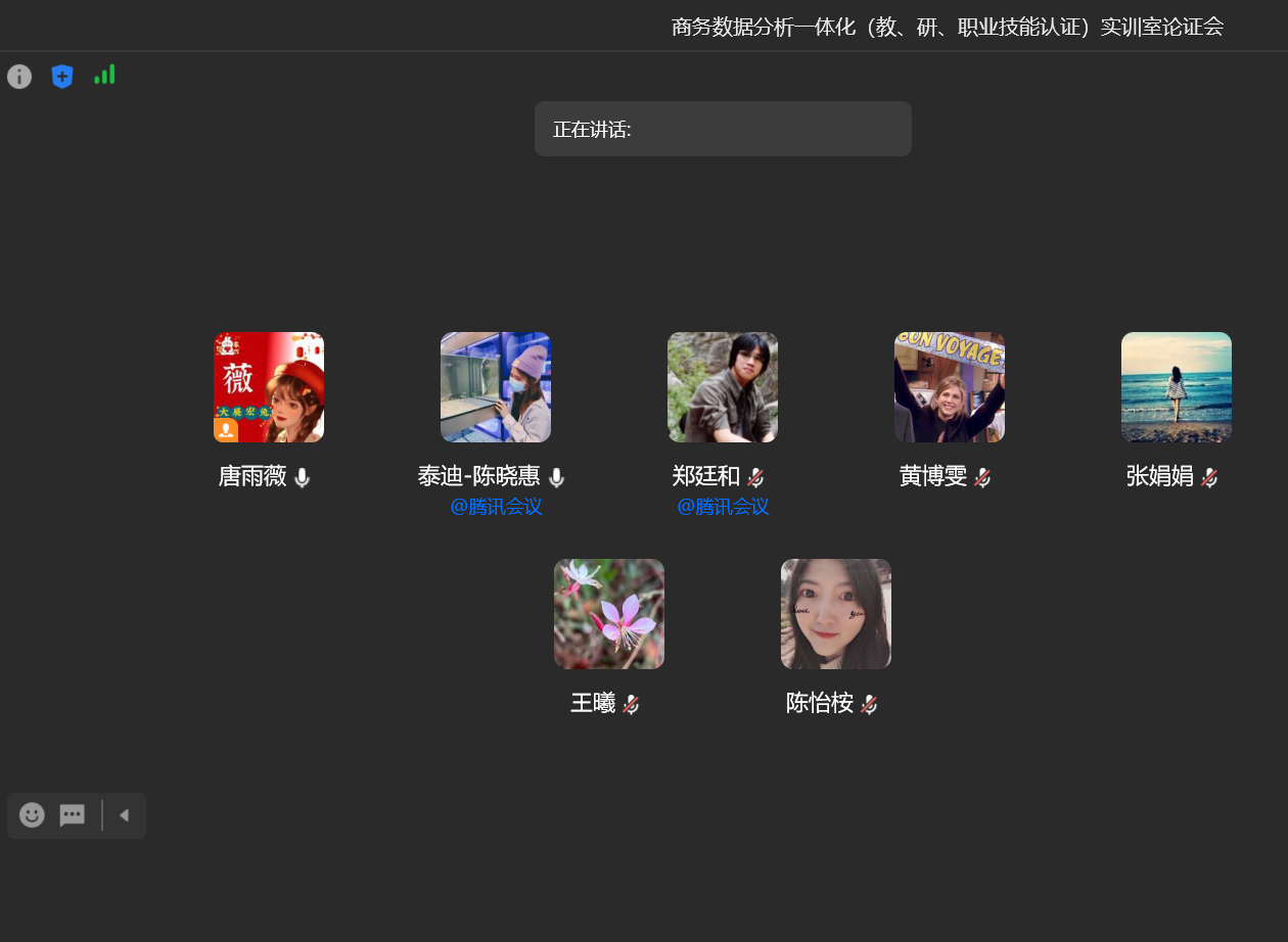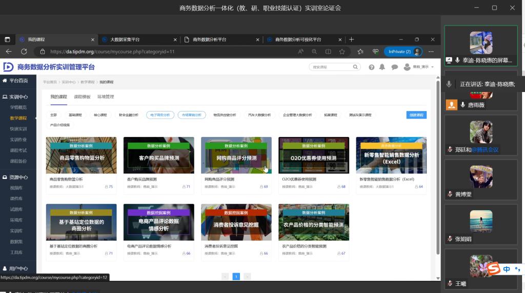 2023年6月27日下午,信息学院商务数据分析与应用专业邀请到了浙江思睿智训科技有限公司、广东泰迪智能科技股份有限公司2家企业展开了一场以“商务数据分析一体化实训室建设”为主题的线上论证会。商务数据分析与应用专业教研室主任唐雨薇、实训教研室主任张娟娟、计算机基础教研室主任王曦、商务数据分析专业专任教师陈怡桉、黄博雯参与了会议。