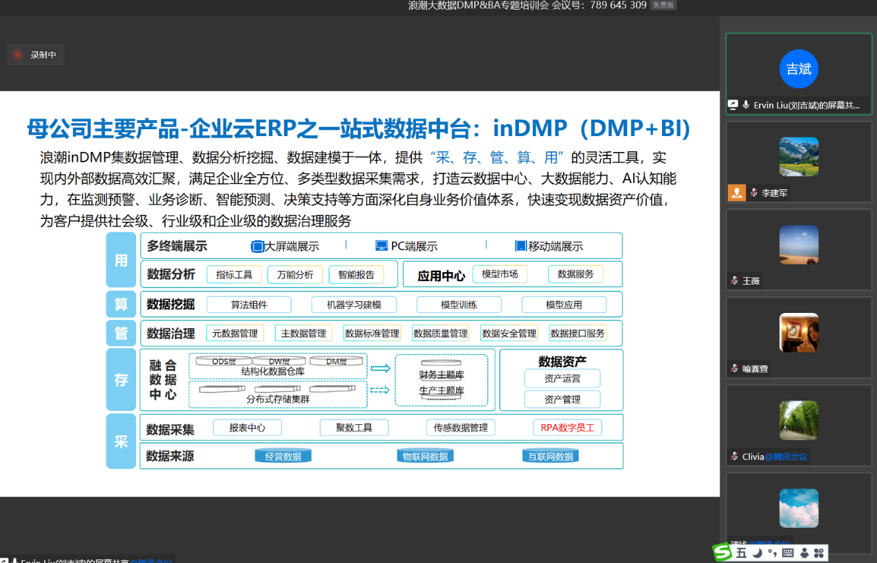 然后,由浪潮集团大数据专家郑经理利用企业实际案例给老师们深入浅出演示讲解了浪潮DMP&BI工具,该工具集数据管理、数据分析挖掘、数据建模于一体,提供“采、存、管、算、用”功能。企业贴心地给每位老师们提供了云账号进行实操。