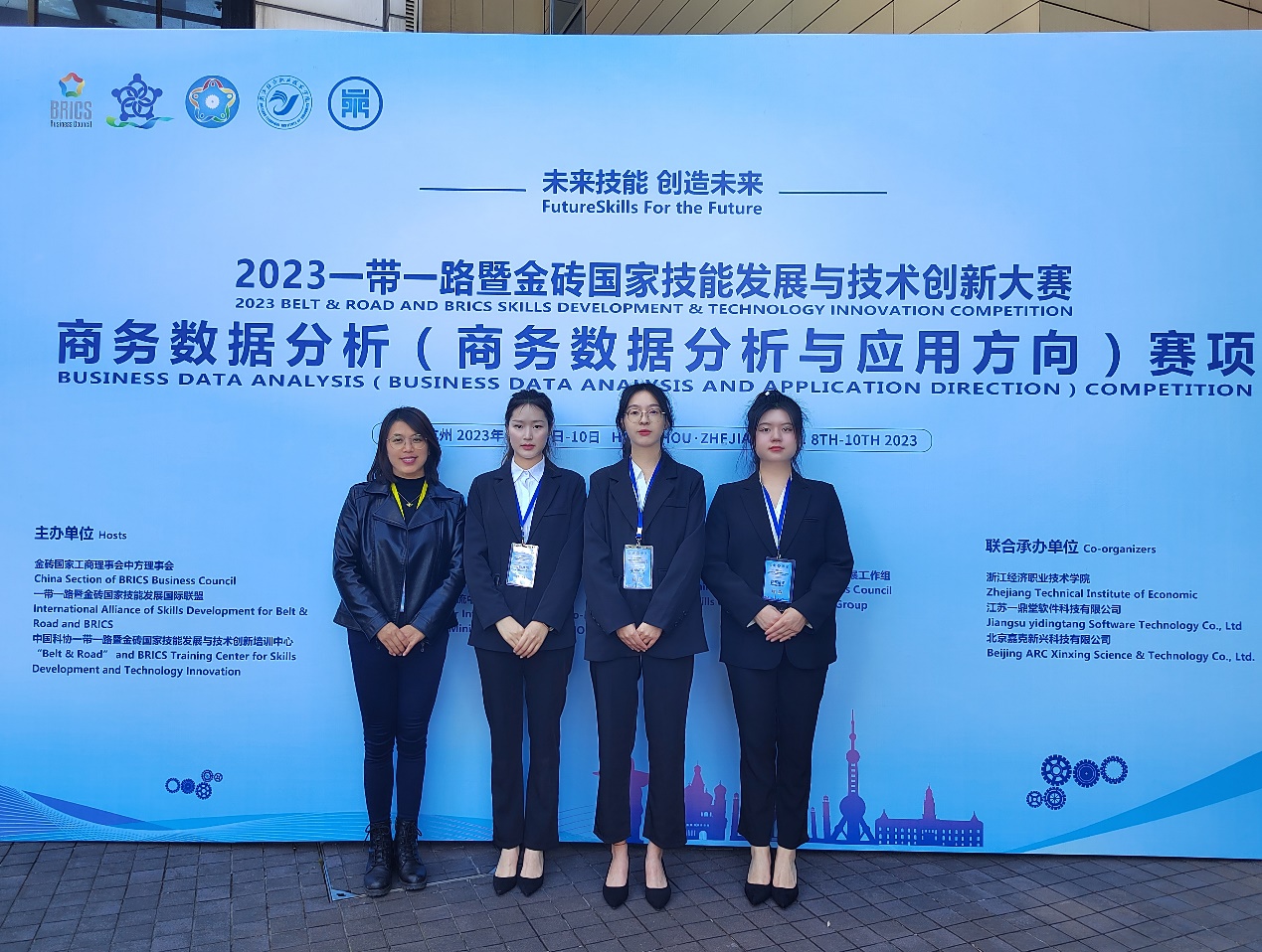 金砖国家工商理事会中方理事会主办的“2023一带一路暨金砖国家技能与技术创新大赛之商务数据分析(商务数据分析与应用方向)赛项”全国总决赛于12月8-10日在浙江杭州举行。由信息学院唐雨薇、陈怡桉老师指导的商务数据分析与应用专业参赛选手(学生:吕芳、范燕妮、李帮琪)从省赛选拔赛300多支队伍中脱颖而出,最终获得全国二等奖,7790cnm必发集团获得优秀组织奖,陈怡桉、唐雨薇老师获得优秀指导教师奖。