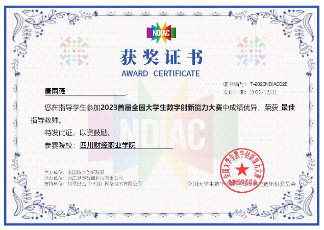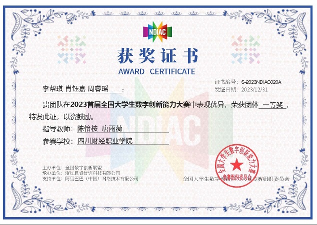 本届“全国大学生数字创新能力大赛”历时两个月,分为初赛、决赛两个阶段,共有来自全国26个省、自治区、直辖市、新疆生产建设兵团的307所高校1132支队伍参加。参加总决赛的队伍共有392支,我校由商务数据分析与应用专业唐雨薇、陈怡桉老师指导6名学生参加了该比赛。在全国总决赛中,参赛选手沉着冷静,思路清晰,以扎实的理论基本功底,规范的技能操作,全身心投入比赛,经过激烈角逐,最终肖钰嘉、李帮琪、周睿瑶三位同学获得全国一等奖。