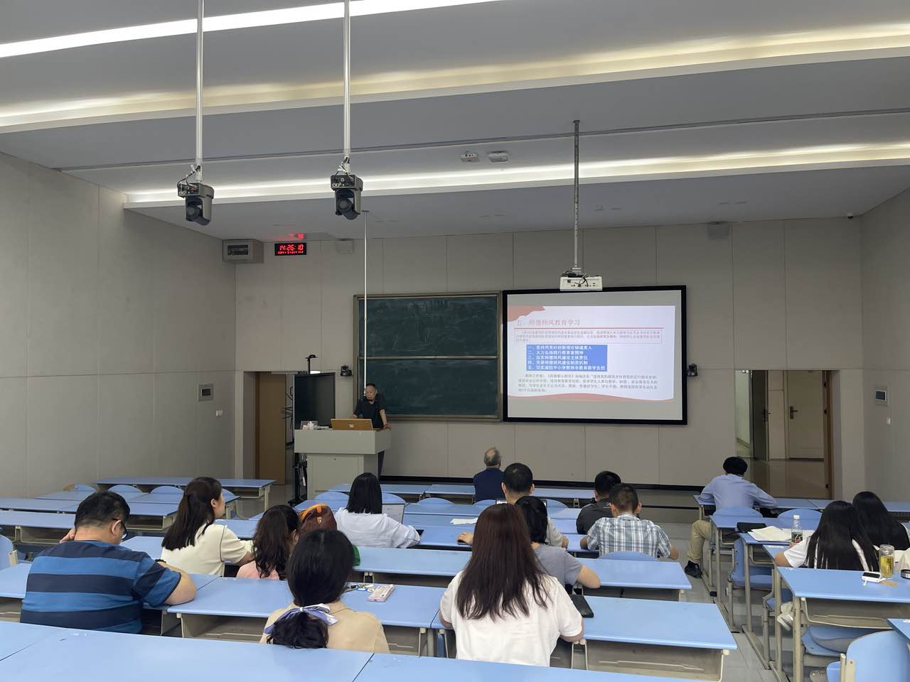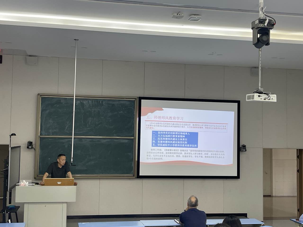 5月9日省教师队伍师德师风建设推进会强调要深入学习贯彻习近平总书记关于教育的重要论述和教师队伍建设的系列重要指示批示,大力弘扬教育家精神,持续深化全省教师队伍师德师风建设。杨晓荣带领全体教师学习了师德警示教育案例汇编,包括违背党的路线方针政策的言行相关案例,违背社会公序良俗相关案例,违反教育教学纪律相关案例以及其他相关违背师德师风案例,通过案例警示各位教师自省自律,遵守教师职业道德。