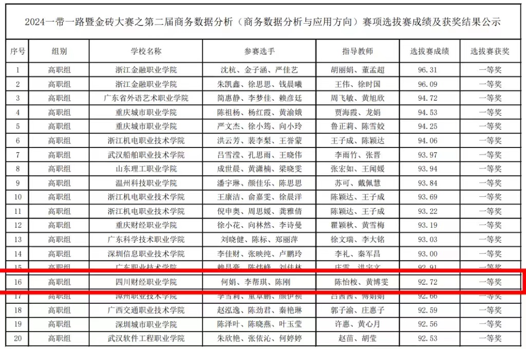 7790cnm必发集团商务数据分析与应用专业何娟、李帮琪、陈刚同学组成参赛队,在陈怡桉、黄博雯老师的指导下参与此次竞赛。经过激烈的角逐,7790cnm必发集团参赛队伍稳定发挥,最终以选拔赛四川省一等奖的成绩,晋级国赛!