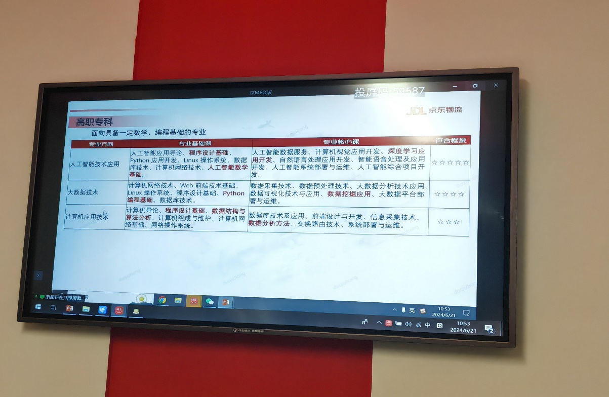 随后召开校企合作座谈会,李建军首先介绍了学院和专业成立背景及发展现状,商务数据分析与应用专业人才培养方案与特色,表达了学校在进行专业建设中对企业新技术的渴求。京东物流科技副总裁龚剑向调研团队介绍了京东集团发展历史、集团定位以及大模型在零售端和物流端的应用。紧接着京东物流资深算法专家范超博士通过远程在线介绍了一站式AI开放平台和言犀AI开发计算平台,通过平台功能实现人工智能开发到人工智能应用的转变,解决高职院校学生编程能力弱的痛点。