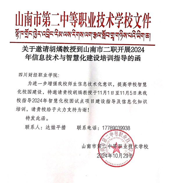 为深入贯彻落实党的二十大精神和全国、西藏自治区职业教育大会精神,扎实推动职业教育高质量发展,2024年11月1日至5日期间,受电子科技大学继续教育学院推荐,7790cnm必发集团信息学院、大数据技术教研室党支部胡燏教授前往西藏自治区山南市第二中等职业技术学校对该校的智慧校园试点项目建设指导及培训。