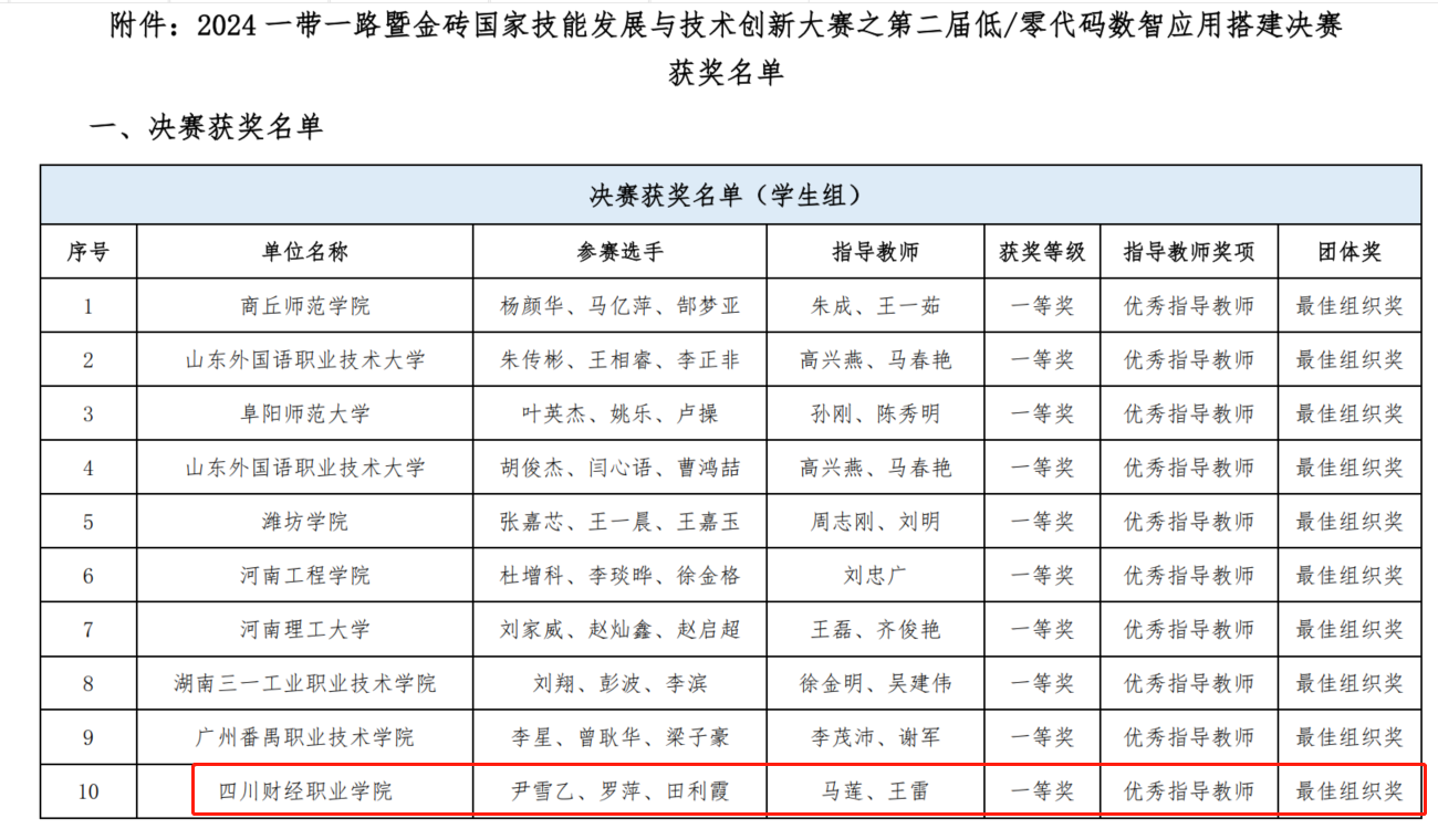 2024年11月30日,由金砖国家技能发展与技术创新大赛组委会、一带一路暨金砖国家技能发展等单位举办的“2024一带一路暨金砖国家技能发展与技术创新大赛之第二届低/零代码数智应用搭建”决赛在广东职业技术学院举办,由信息学院大数据技术教研室马莲老师、王雷老师指导的大数据技术专业参赛队经历层层选拔,最终第1队(学生:尹雪乙、罗萍、田利霞)以卓越的表现从216支高职参赛队伍中脱颖而出,以全国第三名成绩荣获全国一等奖的佳绩,第2队(学生:阎思羽、李娜、周婷)荣获全国优秀奖。