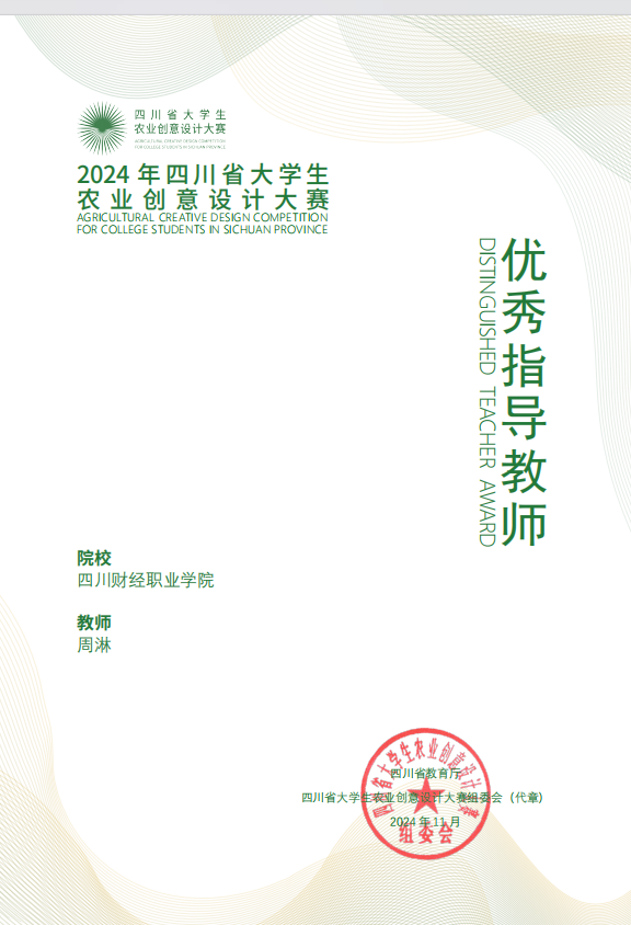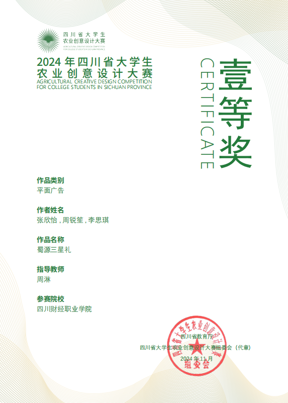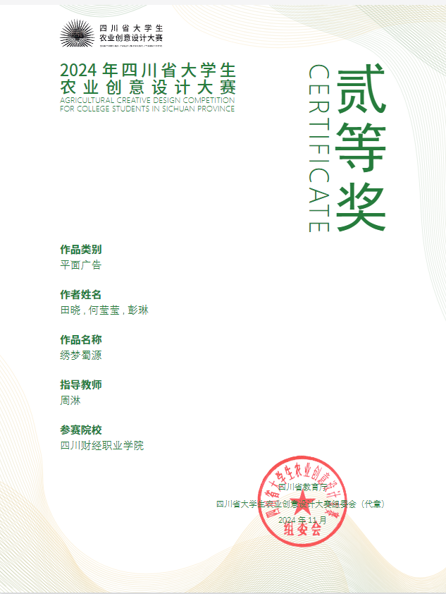 本届大赛紧扣时代脉搏,以“家乡”为主题,鼓励参赛者立足四川丰富的农业资源与深厚的农耕文化底蕴,聚焦家乡故事、家乡印象等方向,运用创新思维和设计手段,为家乡发展贡献青春智慧。大赛吸引了省内众多高校的在校学生积极参与,竞争激烈。经过专家团队严格的初评、复评和终评环节,我校学子田晓、何莹莹、彭琳在该类别中获得二等奖。信息学院学生张欣怡、周锐笙、李思琪在周淋老师的指导下,凭借出色的作品在平面广告类别中荣获一等奖。