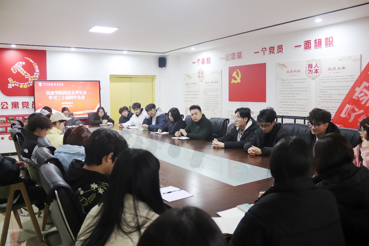 为深入学习领会党的二十届四中全会精神,引导学生干部将思想共识转化为工作实效,12月1日,信息学院于一站式社区党群服务中心党建会议室开展了党的二十届四中全会精神专题学习活动。信息学院党总支书记王东、团总支书记王艺霏、团总支学生会全体干部参与此次专题学习活动。