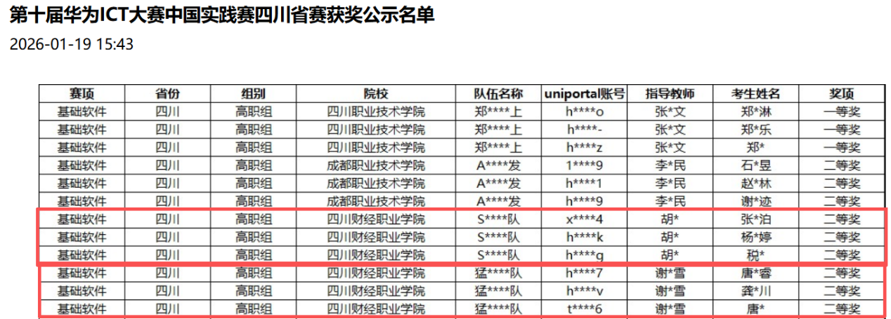 2026年1月20日,第十届华为ICT大赛中国实践赛四川省赛获奖名单正式公布。由胡燏老师指导的人工智能专业学生张朝泊、杨唐婷、税丰,和谢京雪老师指导的信息安全专业学生唐炘睿、龚林川、唐莉组成的2支学生团队,凭借扎实的技术功底与出色的现场表现,均荣获省级二等奖。