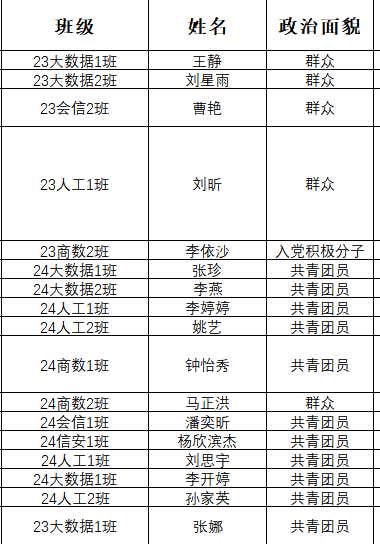 经过学生个人自主申报,班级团支部和团总支初审,二级学院审核同意,产生了2025年春季学期信息学院关于青年马克思主义者培养工程第九期学习班学员拟推荐名单,现予以公示,公示期为3天,名单如下: