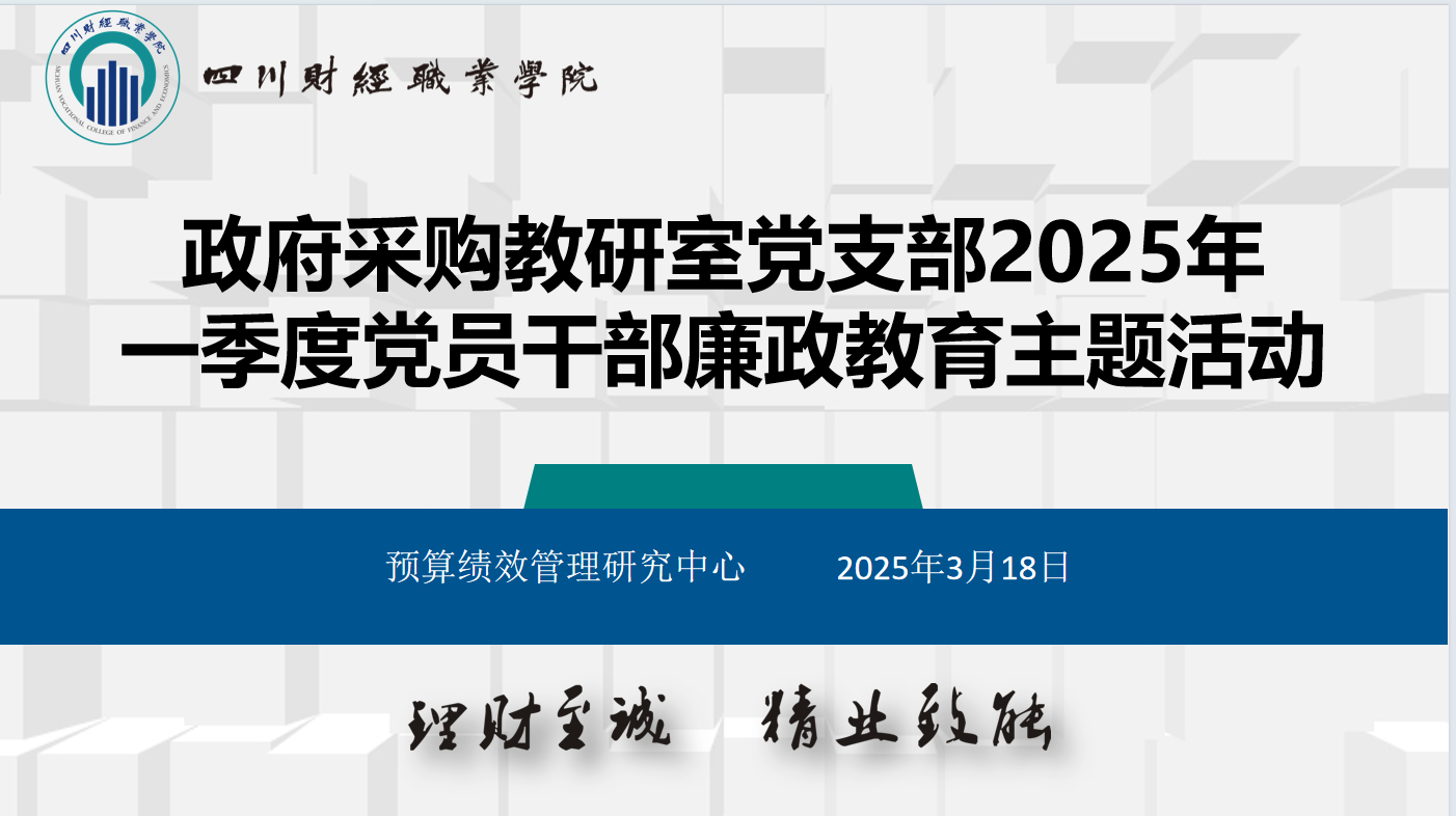 为深入贯彻落实新时代全面从严治党要求,持续强化党员干部廉洁自律意识,政府采购教研室党支部于2025年3月18日上午组织开展一季度廉政教育主题活动。预算绩效管理研究中心全体党员干部通过"学文件、析案例、观警示"三阶递进式学习,接受了一次深刻的思想政治洗礼。